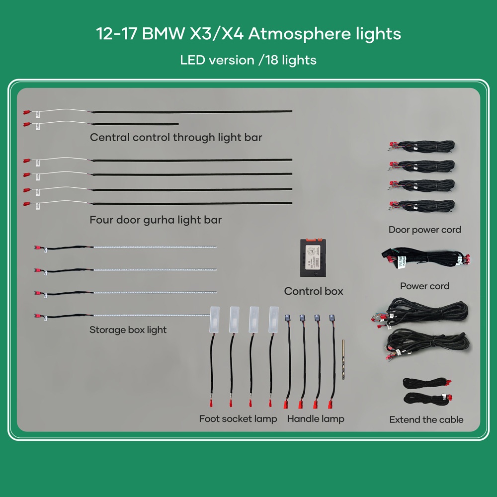 - Standard 17pcs lamps (4 door handle lights, 4 door outline lights, 4 door storage box lights, 4 footwell lights, 1 central light).